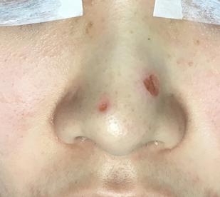 左邊的較大墨痣90%癒合,少少結焦會很快脫落. The bigger mole on the left side heals to 90%. There is still some scab on the wound and will fall out in a weeks' time.