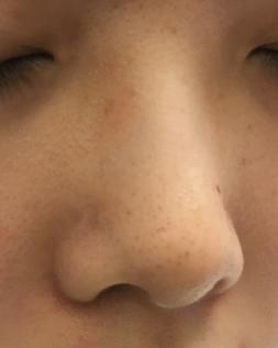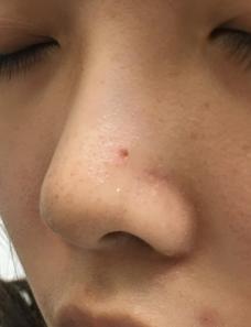 鼻子上面有2顆淺色的痣。左邊的比較大。右邊的比較小。2 light colour skin moles on the nose. The one on the left is bigger and the one on the right side is smaller.